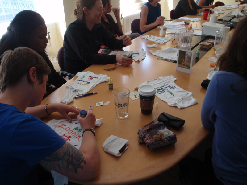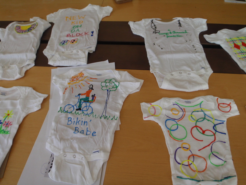 TransFormers making onesiesMy office is super cool.  When a baby is a’comin, they pull out the puffy paints and have a onesie-making party.  Today, my colleagues decorated newborn garments in the Fruitbat’s honor.